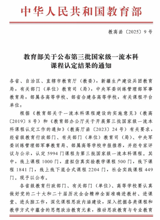 近日,教育部印发《关于公布第三批国家级一流本科课程认定结果的通知》(教高函〔2025〕9号),正式公布第三批国家级一流本科课程名单。测绘与空间信息学院喜获佳绩,新增4门课程入选,至此学院国家级一流本科课程总数达到6门,标志着学院本科课程建设水平迈上新台阶。