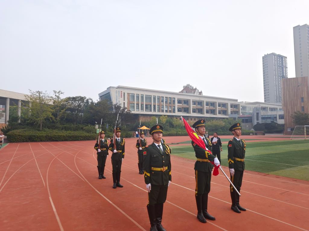 上午8时,运动场内气氛热烈。伴随《运动员进行曲》激昂奏响,入场式正式启动。国旗护卫队作为首支方阵率先入场,队员们身着笔挺礼服,精神抖擞,护持国旗,步伐铿锵有力。