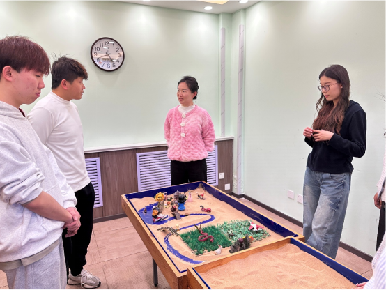 活动伊始,赵铭向同学们系统介绍了沙盘游戏的基本理念与操作流程,引导大家在一个安全、自由、受保护的空间中,借助沙具选择和沙形塑造,自然表达内心世界。在轻松愉悦的氛围里,同学们依次挑选心仪的沙具,共同搭建起富有象征意义的沙盘场景。从创意构想到故事分享,每个环节都让大家在沉浸式体验中加深了对自我和他人的认知,也学会了倾听与共情。